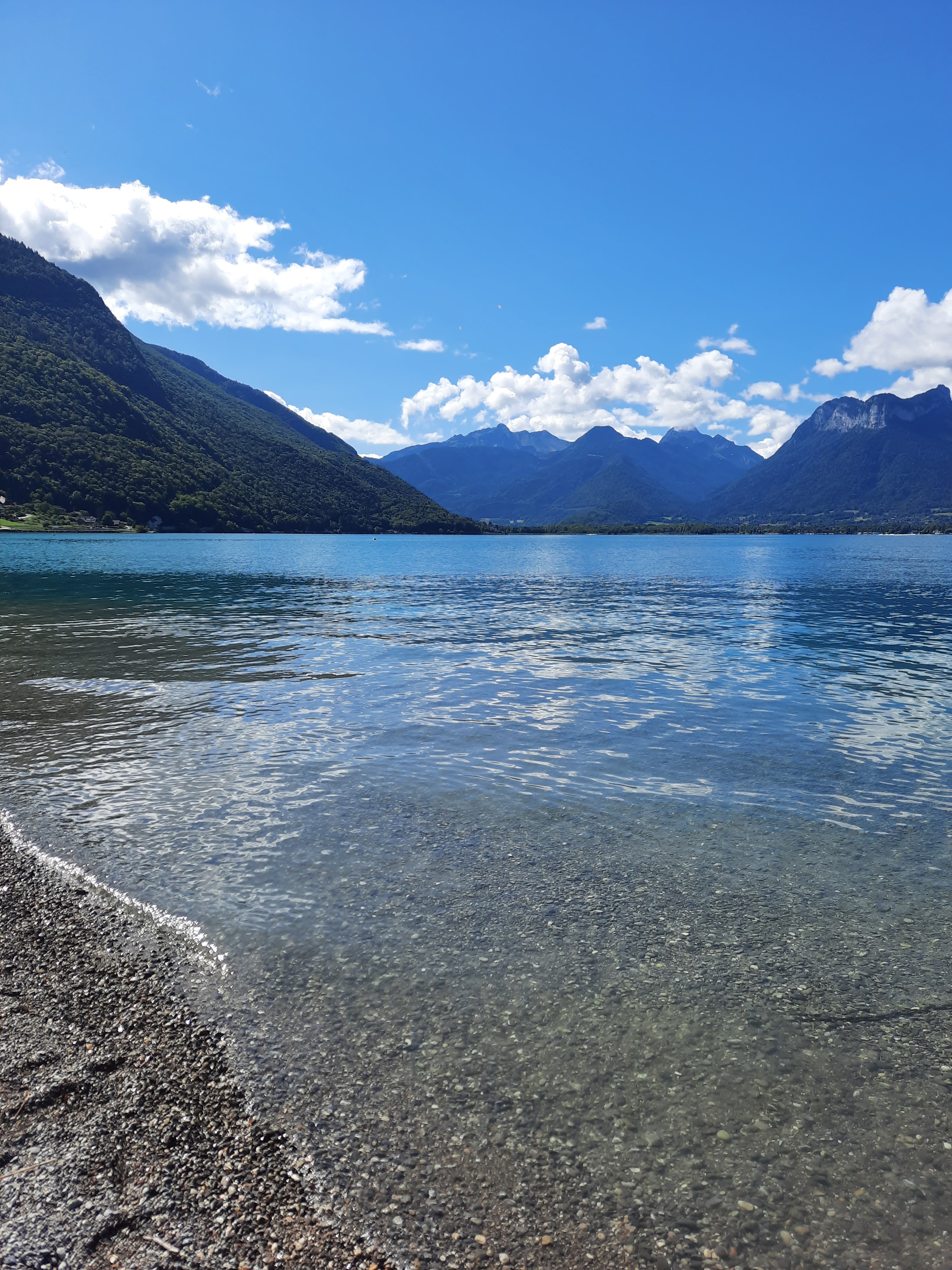 Belle plage au lac d'annecy. Un grand parking et un accès facile. De quoi se reposer au bord du lac en profitant de la beauté du paysage où se refroidir dans l'eau fraîche et propre du lac 👍🏻