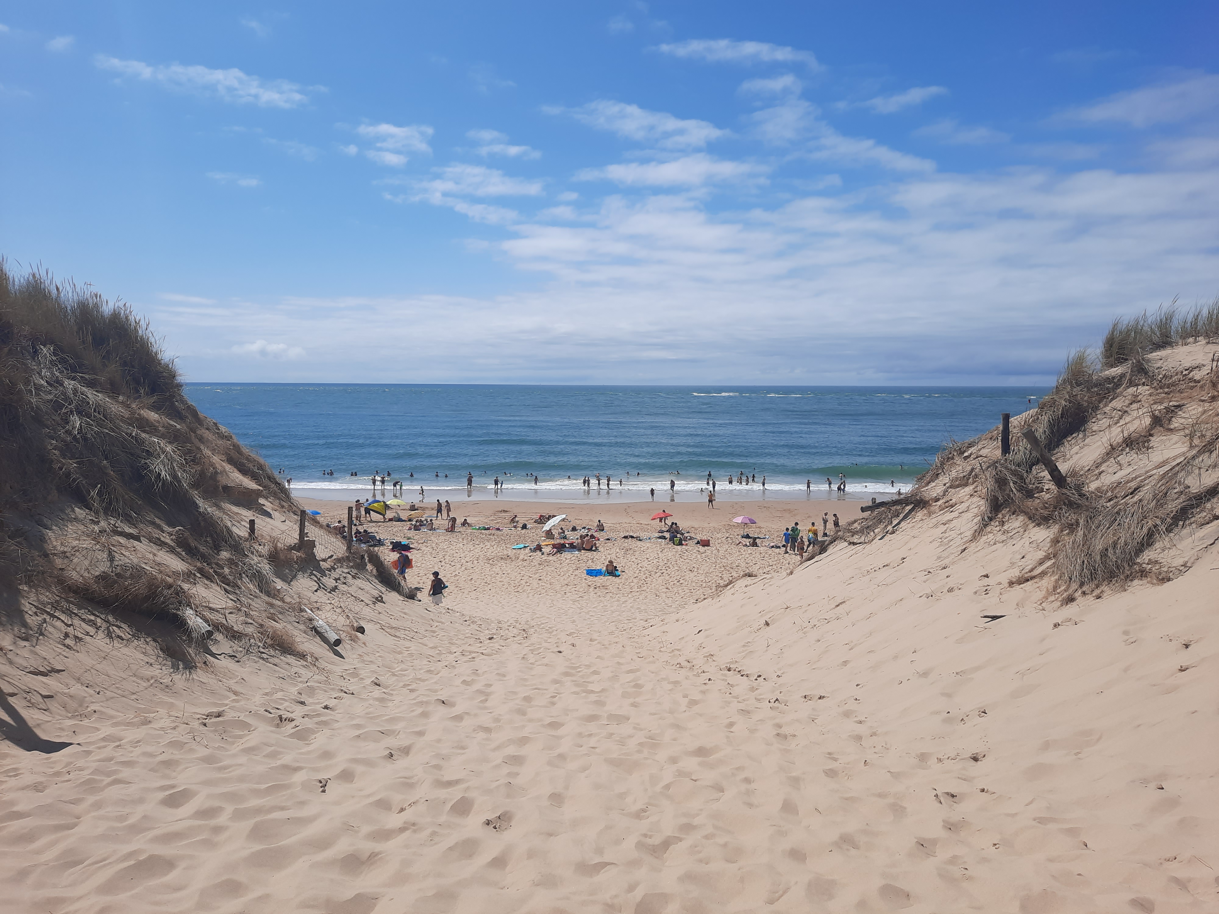 Posté le 22/08/2023 à 17:27"La plage se mérite, il faut marcher dans les dunes environ 1/4 d'heure. Le sentier est balisé. Très beau panorama. Baignade surveillée sur quelques dizaines de mètres en haute saison. Attention aux baïnes, aux courants et aux vagues, cela restent une plage à surf."