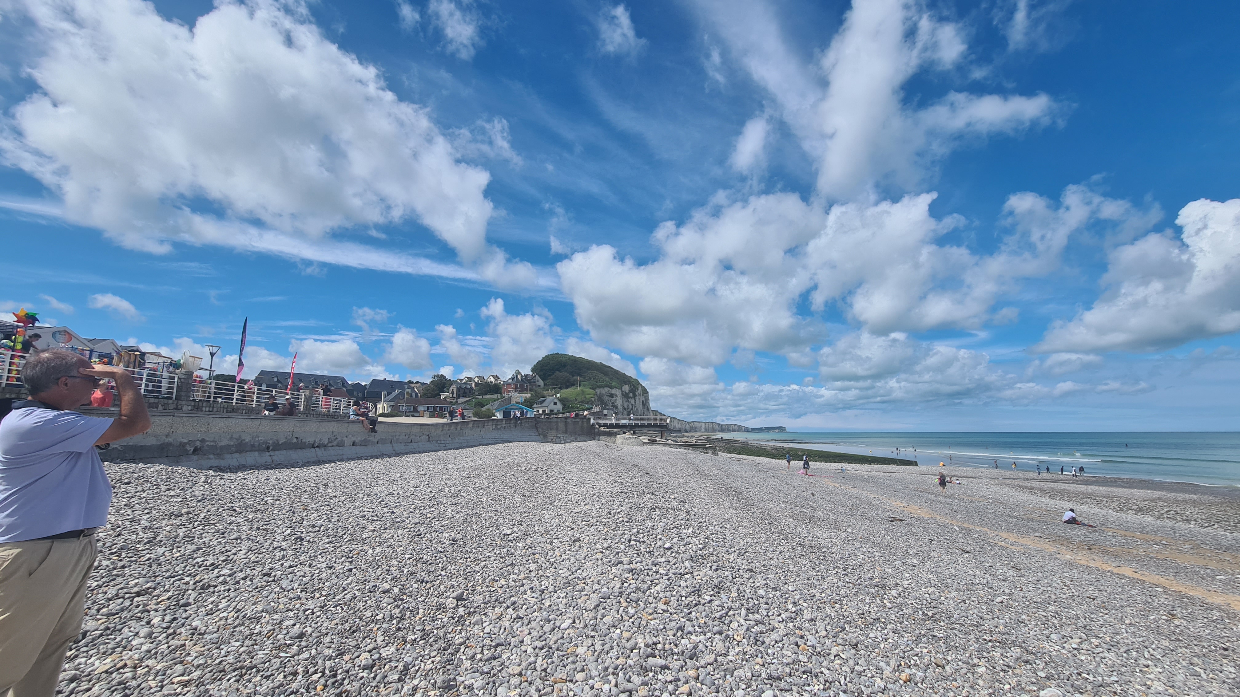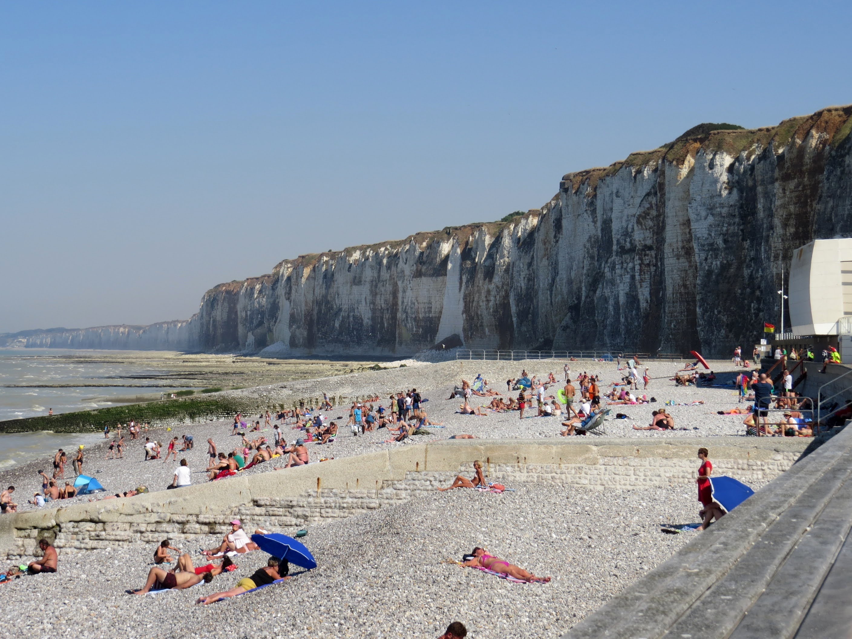Pas trop de monde en juin,lieu venté ! Paysage magnifique, la côte avec ce blanc craie...des galets pas mal quand même mais pour nous pas de problème, le port est super sympa, vente du poisson direct pêcheur le matin...chouette